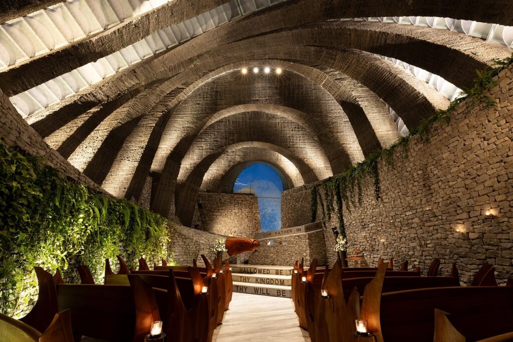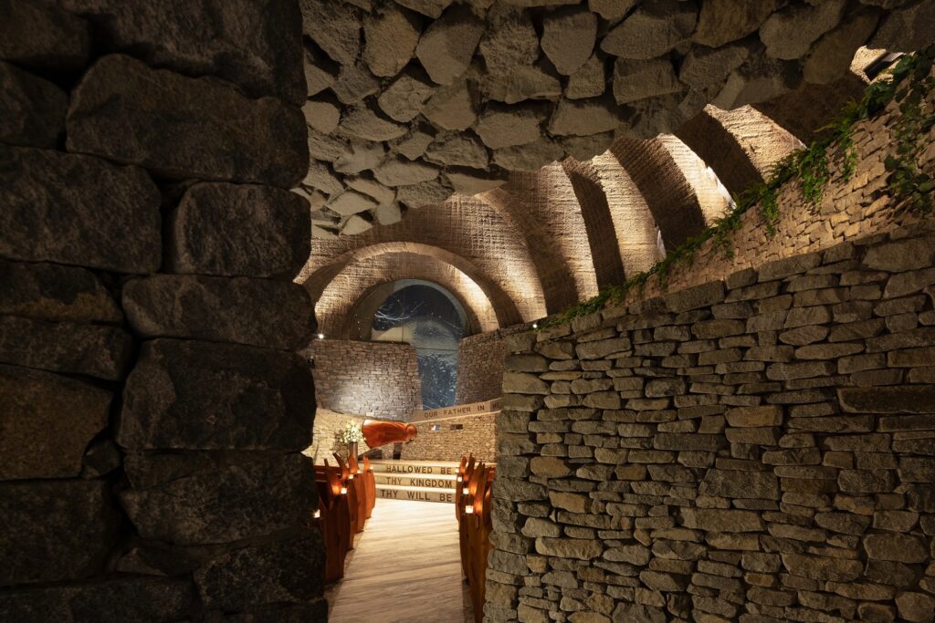 Sixteen discreet spotlights reveal the textured surfaces of the stonework, while four narrow-beam projectors positioned eight metres high illuminate the altar and pews. During evening ceremonies, the artificial light is almost absent, leaving the candle flames to reshape the space.