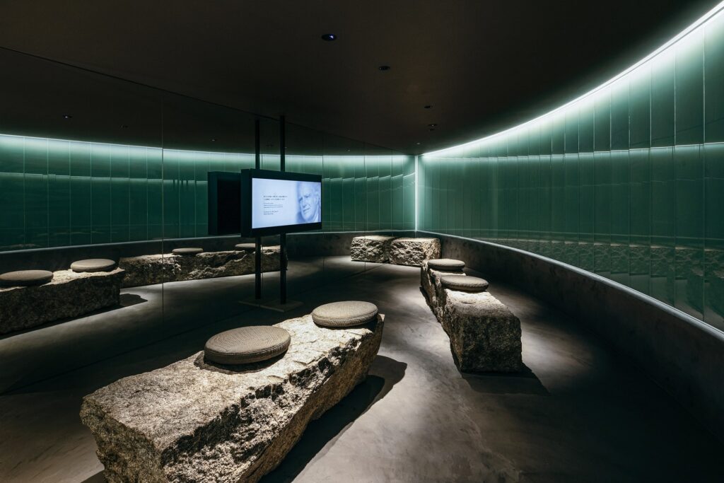 The basement memorial to Kanzo Uchimura, constructed from glass and stone, is subtly lit to reinforce the stoic spirit of his non-church philosophy.