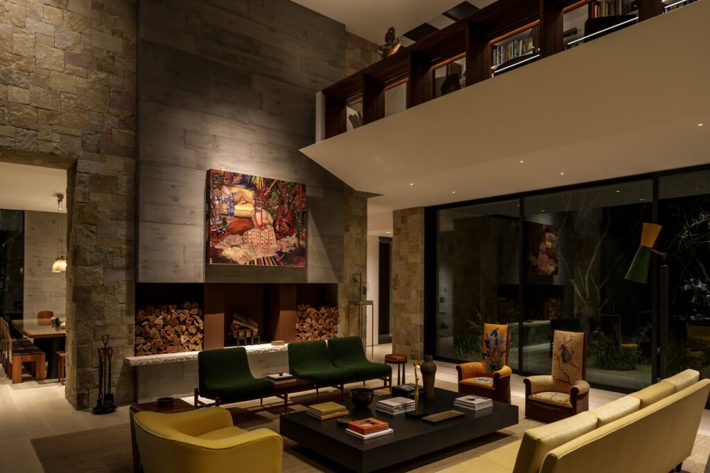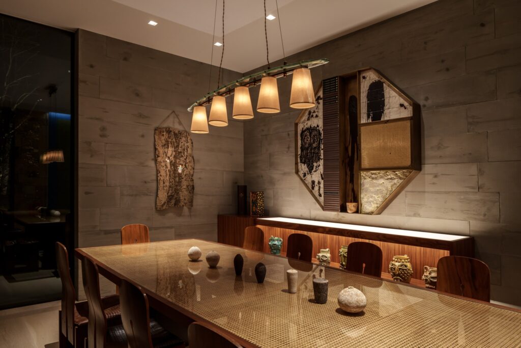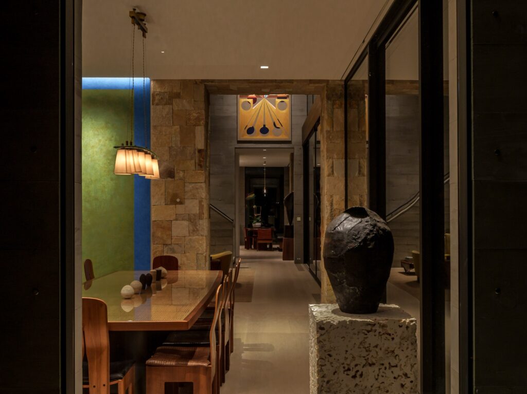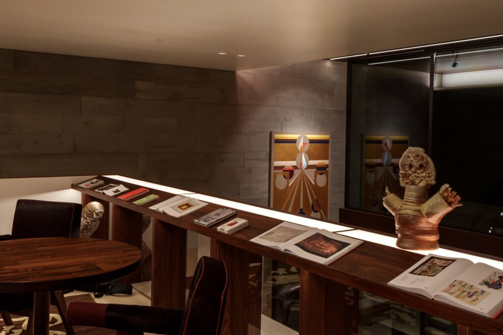 Custom panels in rice paper and glass are built into the millwork—above a bookrail in the library and within a dining room credenza, casting a warm, diffused glow that enriches books, sculptures, and surfaces alike. Track-mounted monopoints allow the art program to evolve, while miniature strip lights remain hidden, drawing focus to the rich warmth and texture of the wood.