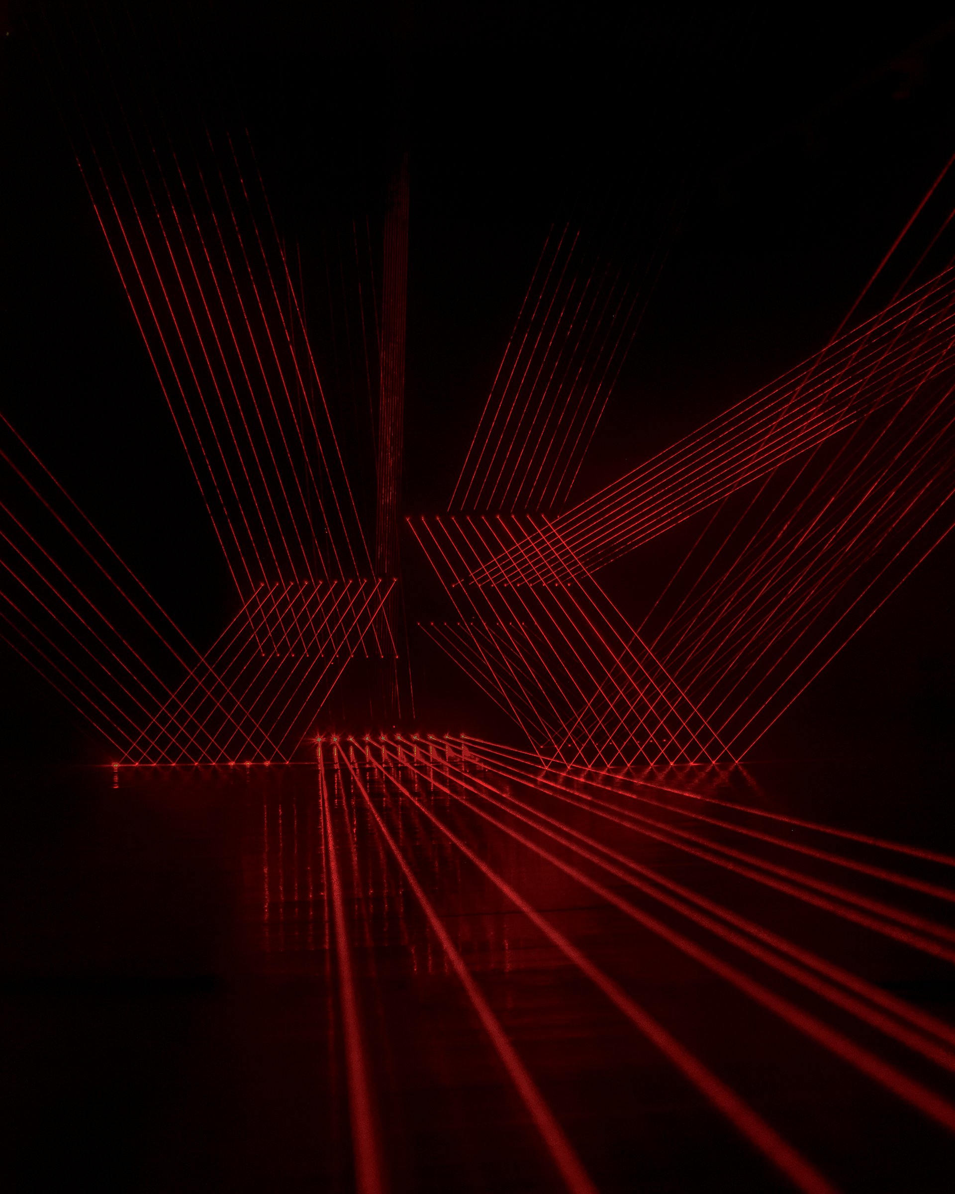 «Worlds of Light è una scultura luminosa site-specific, composta da fasci laser rossi. Ci ispiriamo a riferimenti collettivi: il pubblico percepisce il dispositivo e si sente invitato a partecipare. Muovendosi e interrompendo i fasci, modula l’opera e crea nuove composizioni in tempo reale. Partiamo da una composizione iniziale come quadro di riferimento; l’opera si completa nel dialogo con chi la attraversa. Così la “luce partecipativa” diventa co-autorialità: non si contempla l’opera, ma la si costruisce con il corpo e la presenza».