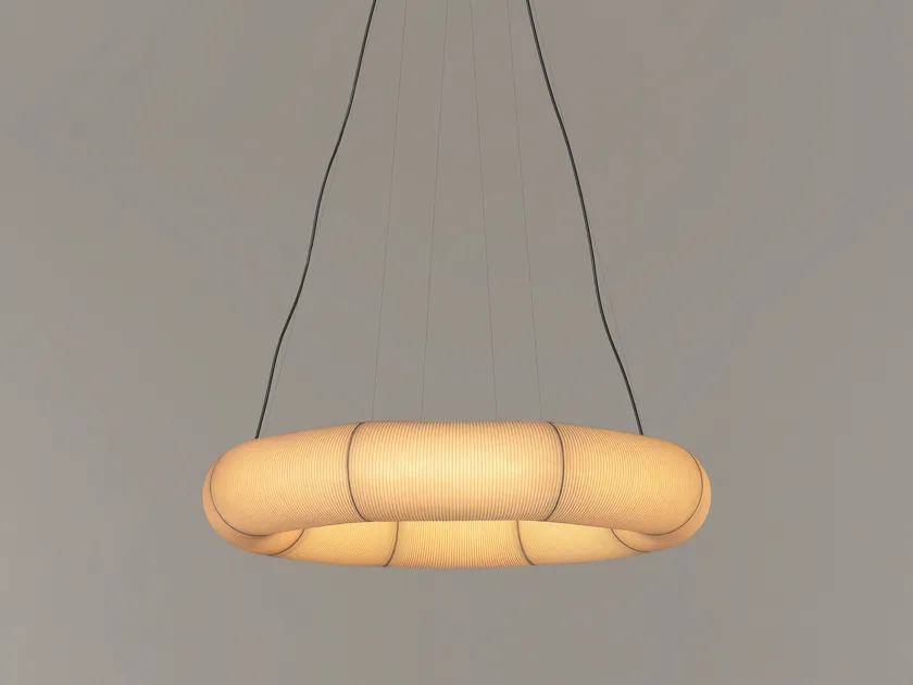Moduli diversi consentono di creare sospensioni dall’andamento orizzontale, verticale o grandi cerchi, perfetti sopra il tavolo da pranzo. Tekiò di Santa&Cole unisce la tecnologia del warm dimming, che consente di cambiare la temperatura colore del Led, alla bellezza ruvida della carta.