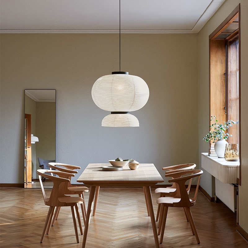 Jaime Hayon per &Tradition disegna una lampada in carta che unisce suggestioni del Sol Levante e minimalismo scandinavo. La famiglia Formakami comprende diverse versioni, accomunate da una struttura tutta curve in rovere tinto nero e carta.