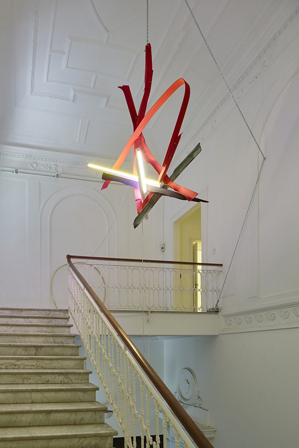 Nelle opere di Handforth la luce assume un ruolo strutturale. Elementi come neon, lampade stradali o tubi fluorescenti vengono inseriti all’interno di composizioni che sfruttano la luminosità come linea, segno o superficie. L’artista interviene spesso sulla componente cromatica, filtrando il fascio luminoso attraverso gel colorati o studiando il comportamento della luce sulle superfici metalliche. Il risultato è una geometria luminosa che modifica la percezione dello spazio, creando zone di intensità, ombre dilatate o riflessi inattesi.