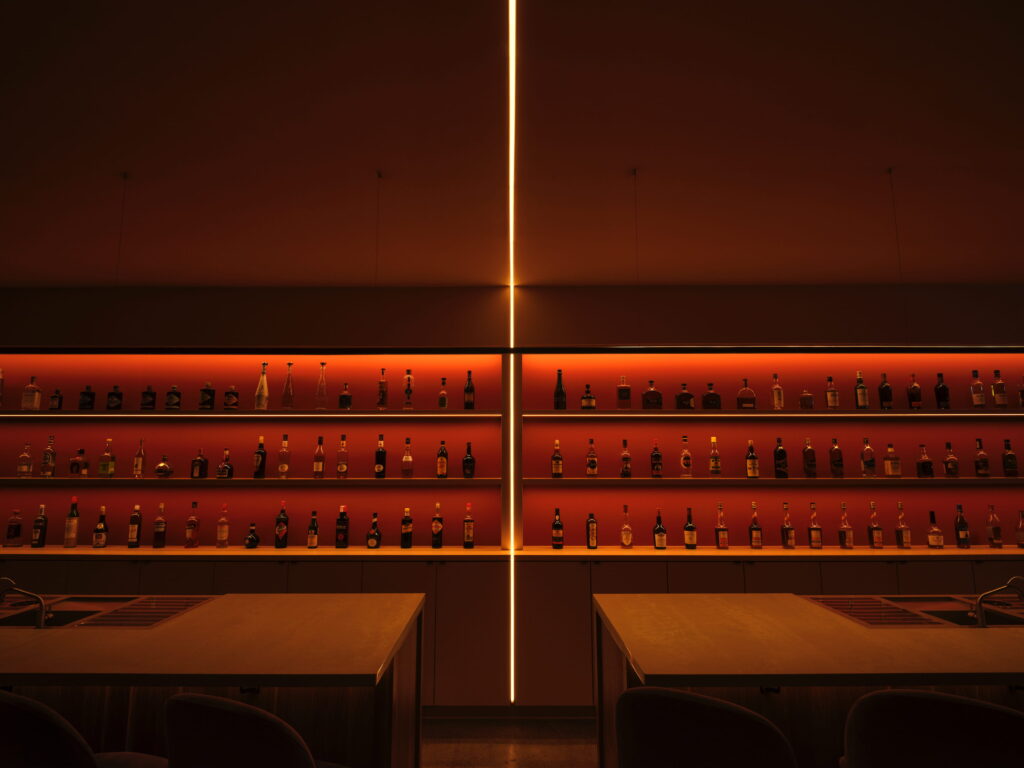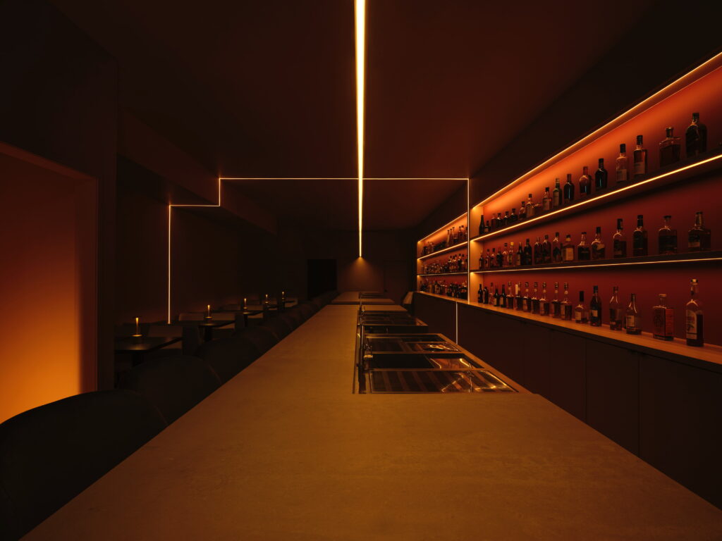 Di fronte alla postazione del bartender, una serie di tavoli e sedie con piccole lampade da tavolo completano lo spazio. Andrew Sun, fondatore dello studio, racconta: «L’illuminazione ambientale è stata calibrata con molta attenzione: i tavoli sono illuminati da una singola fonte che fornisce la luce necessaria affinché gli ospiti possano leggere comodamente il menu, mentre l’atmosfera generale rimane volutamente morbida e suggestiva».