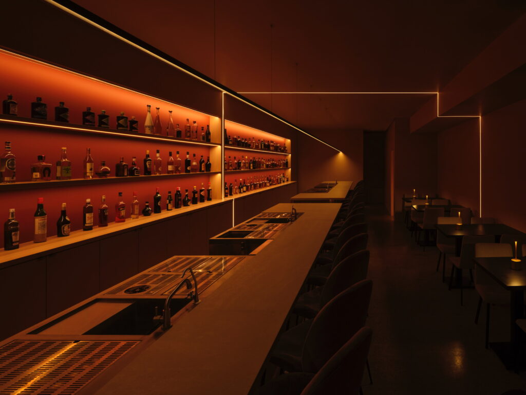 Questo ritmo accompagna gli ospiti lungo tutto il bar, guidandoli intuitivamente e permettendo loro di vivere appieno l’illusione speculare lungo il percorso. Le proporzioni sono diventate un’opportunità per costruire una serie di momenti immersivi mentre ci si muove nell’ambiente. Ogni gesto luminoso e ogni scelta materica sono stati calibrati con precisione per ampliare la percezione della larghezza e accentuare il carattere atmosferico e leggermente futuristico del bar».