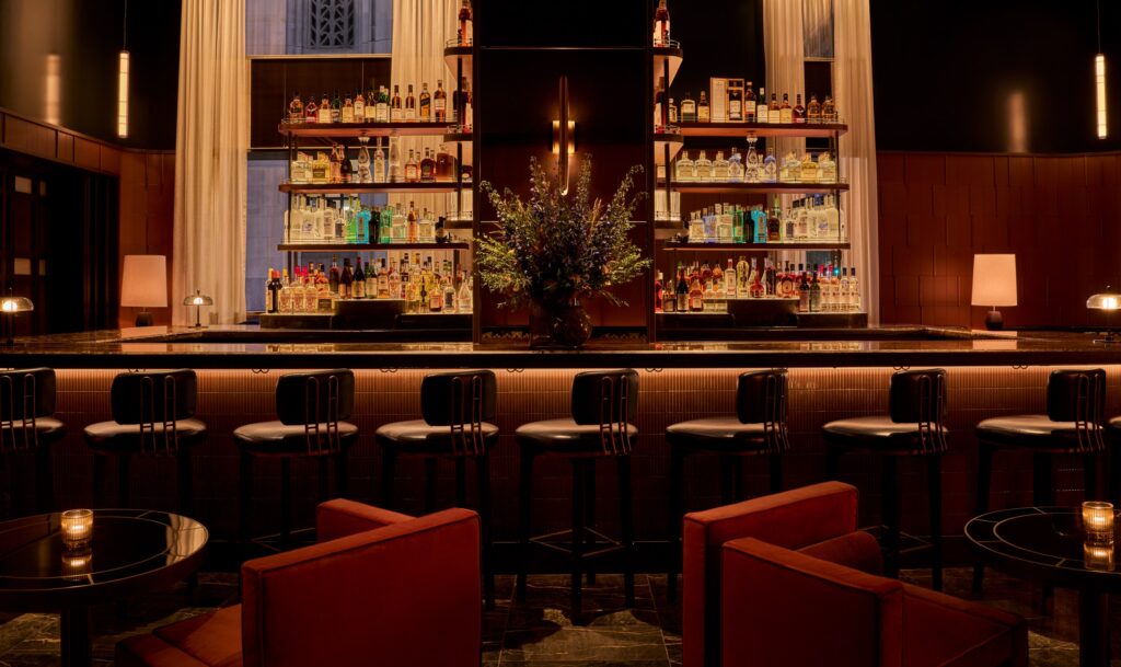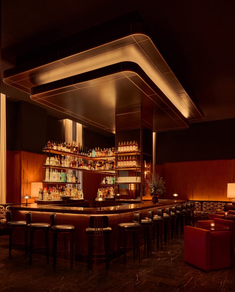 Guests enter through a double-height entrance leading to the bar area, designed with soft lighting that highlights furniture details and the counter while echoing New York’s Art Deco influences. From here, guests access the main dining room, which features a symmetrical layout of tables and seating and a selection of high-quality materials: marble, leather, wood finishes, and metals.