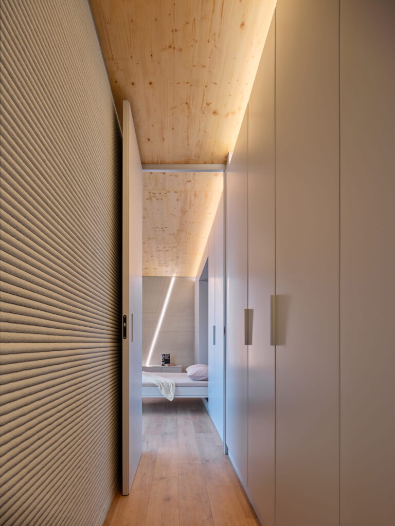 «The building’s form was largely shaped by the buildable area available on the site. We maximized the footprint and softened the volume with rounded geometries. The lighting strategy was closely tied to orientation and context: most of the openings face northwest, framing unobstructed views of the surrounding landscape. Wall recesses were used to integrate LED lighting, concealing cables and technical components within the structure. This made it possible to keep the wooden ceiling fully visible. Both direct and indirect lighting was carefully designed and supported by a smart system that adjusts colour temperature and intensity according to usage and mood».